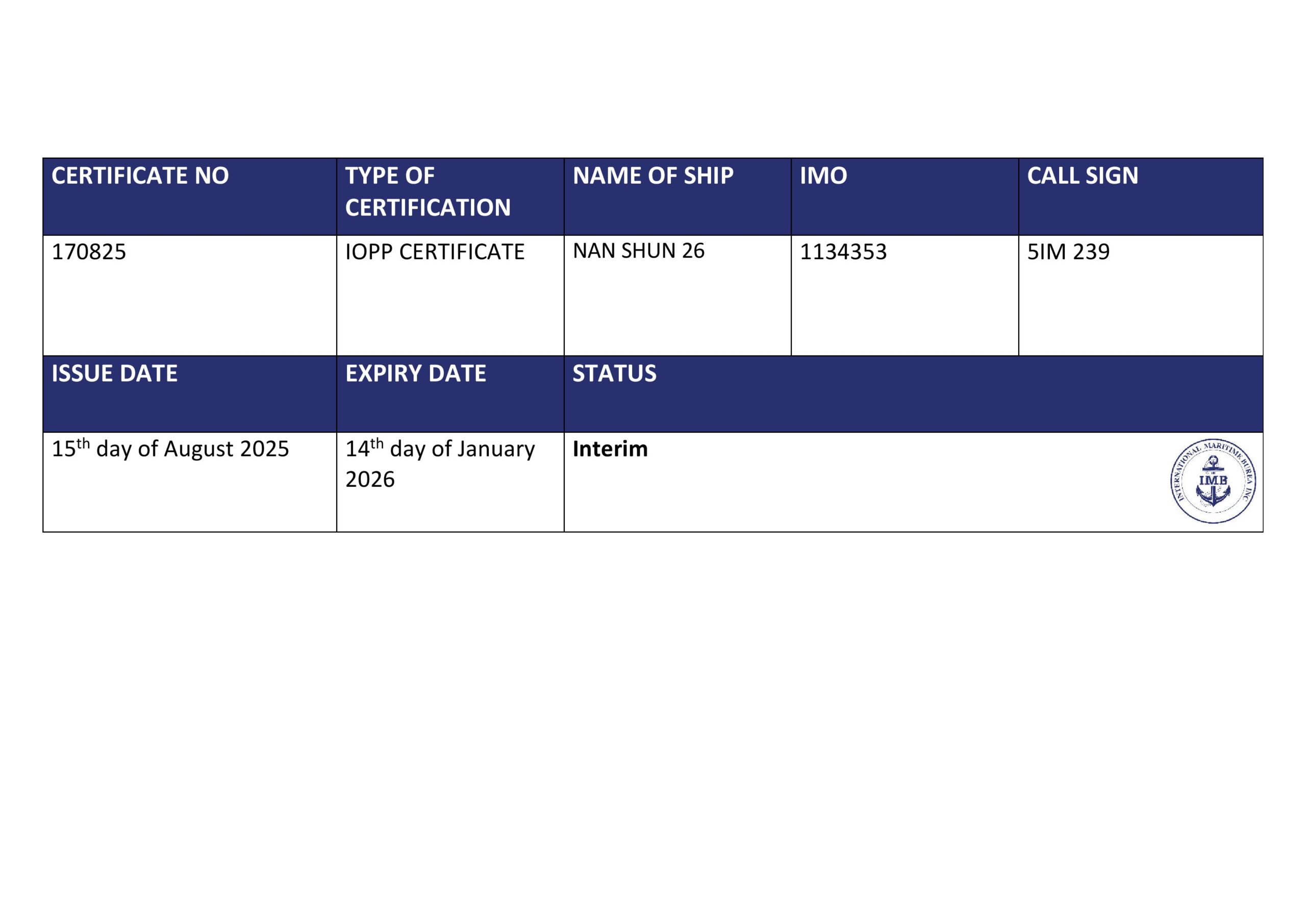 M/V NAN SHUN 26 – IOPP CERTIFICATE