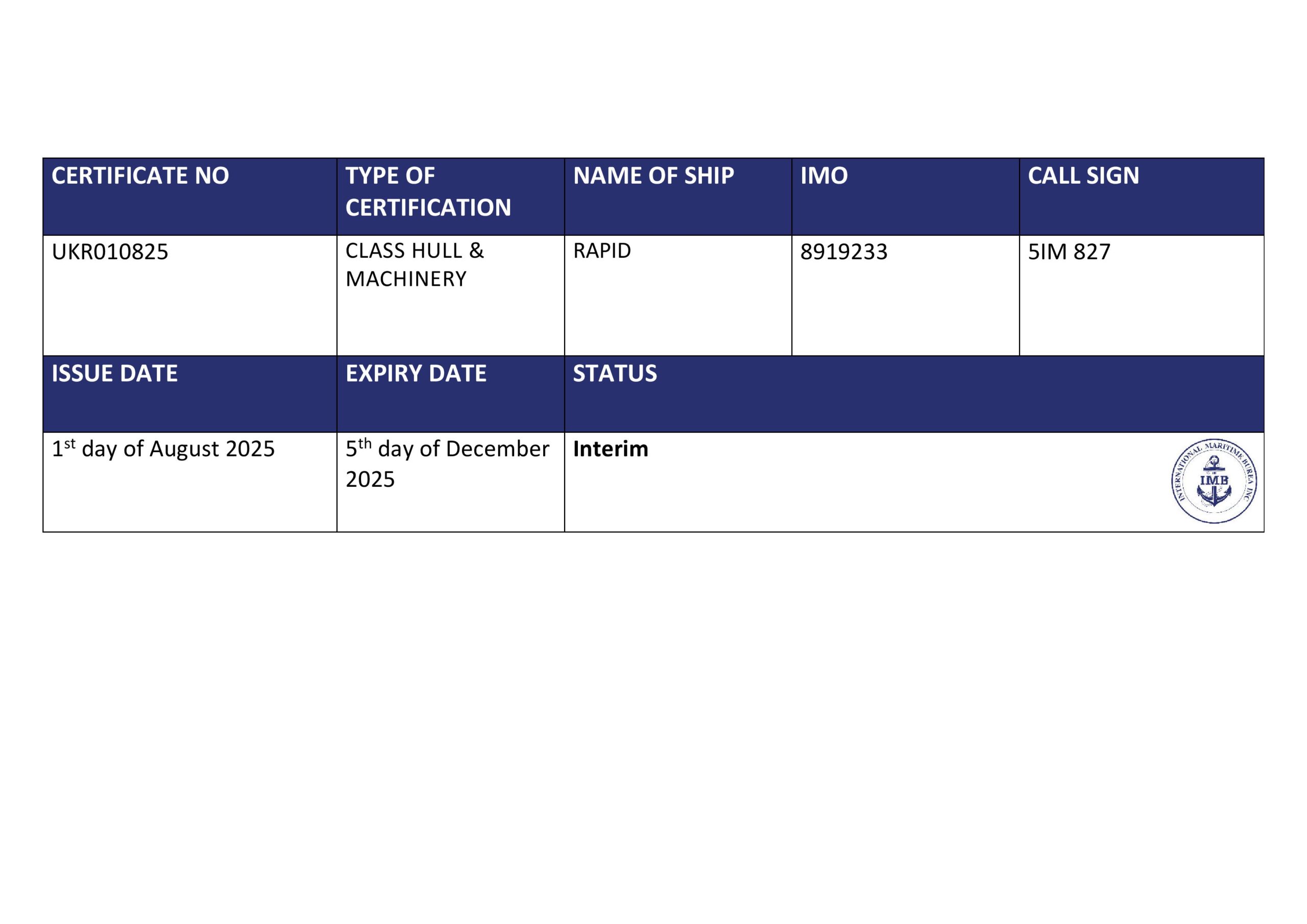 M/V RAPID – CLASS HULL AND MACHINERY CERTIFICATE